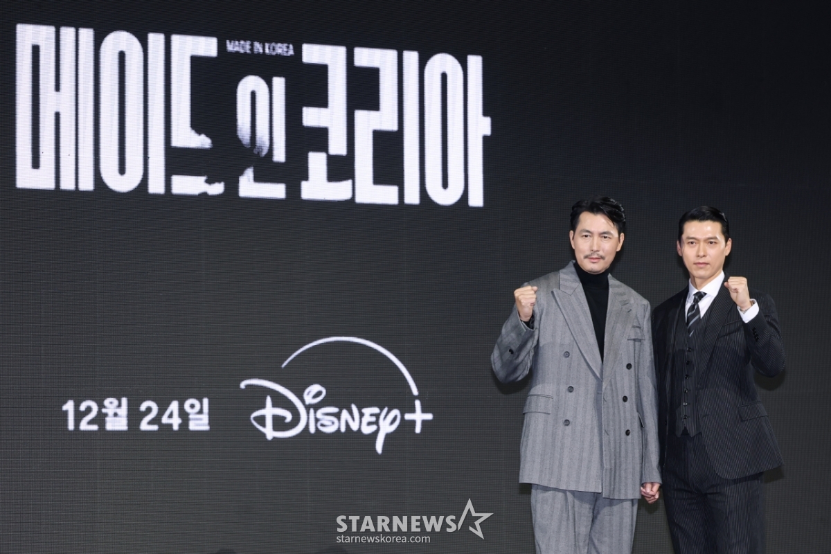연예방송정우성-현빈 '메이드 인 코리아, 기대하세요'[★포토]발행 : 2025.12.15 ・ 11:08이동훈 기자배우 정우성, 현빈이 15일 오전 서울 강남구 그랜드 인터컨티넨탈 서울 파르나스 호텔에서 진행된 디즈니+ 오리지널 시리즈 '메이드 인 코리아' 제작발표회에 참석해 포즈를 취하고 있다.부와 권력에 대한 야망을 지닌 남자와 그를 막기 위해 모든 것을 내던진 검사, 시대의 소용돌이 속 펼쳐지는 이야기 '메이드 인 코리아'는 오는 24일 공개된다. /2025.12.15<저작권자 © 스타뉴스, 무단전재 및 재배포 금지>메이드인코리아현빈정우성우도환서은수원지안추천 기사이동훈 기자기자홈좋아요 연예-방송의 인기 급상승 뉴스연예-방송의 최신 뉴스