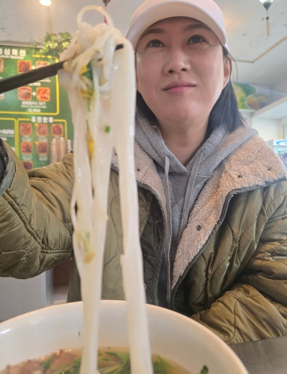 공개된 사진에는 도경완이 촬영한 것으로 보이는 장윤정의 모습이 담겼다. 칼국수 맛집을 찾은 장윤정은 면을 들어 보이며 미소를 짓고 있다.