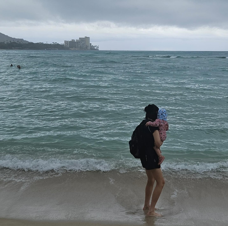 공개된 사진에는 아들을 품에 안고 하와이 해변을 바라보는 이은형의 모습이 담겨 있다. 흐린 날씨로 인해 하와이의 아름다운 풍광을 감상할 수 없어 아쉬움을 자아낸다.