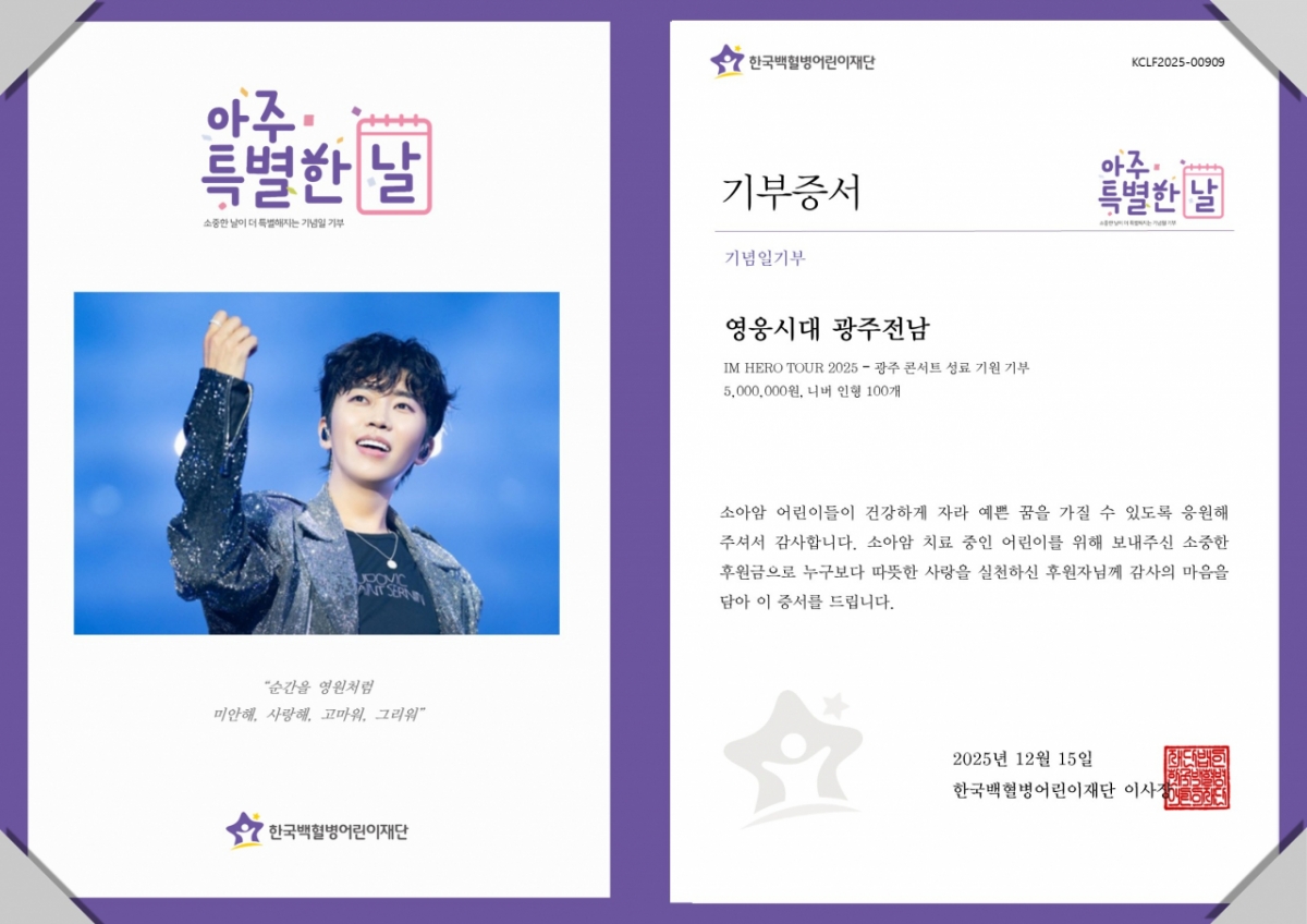 팬카페 관계자는 "다가오는 광주 콘서트를 기다리며 팬들이 마음을 모아 준비한 나눔이라 더욱 의미가 크다"며 "임영웅 씨가 늘 보여주는 따뜻한 마음을 응원하는 마음으로 기부에 동참했다. 이번 나눔이 아이들에게 작은 위로와 힘이 되길 바란다"고 전했다.
