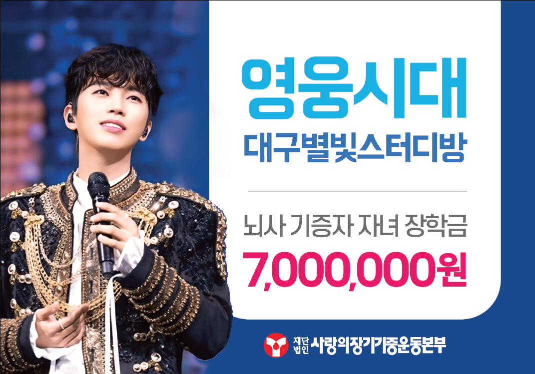 (재)사랑의장기기증운동본부(이하 본부, 이사장 유재수)는 12월 16일 임영웅의 팬클럽 '영웅시대 대구별빛스터디방'이 뇌사 장기기증인 유자녀를 위한 D.F장학회에 후원금 700만 원을 전달했다고 밝혔다.