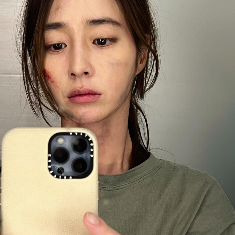 사진 속 이민정은 얼굴에 피 묻은 상처와 거뭇거뭇한 멍자국 분장을 한 채 거울을 바라보고 있는 모습. 화장기 없는 비주얼에 다소 지친 표정이지만, 그럼에도 숨길 수 없는 아름다운 미모가 눈길을 끈다.