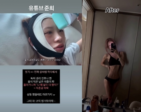 최준희는 최근에는 자신의 광대, 눈 성형 수술 직후 얼굴 변화 과정을 영상에 담아 공개하고 붓기가 빠지고 일주일이 지난 시점에 "아직 약간 땡땡한 부분이 있다"라고 말했고 마지막 붓기 시점을 거치고 나서는 "진짜 붓기도 많이 빠지고 피부도 안정화가 많이 됐다. 집에서 붓기 관리 제품들을 잘 챙겨 먹어준 것도 효과가 있다고 생각하고 있다"라고 말했다.