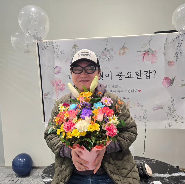 공개된 사진 속에는 60번째 생일을 맞아 소속사 직원들의 축하를 받고 있는 김의성의 모습이 담겼다. 현수막에는 '나이가 뭣이 중요환갑?'이라는 문구가 적혀있으며 김의성은 형형색색의 꽃을 들고 환하게 웃고 있다.