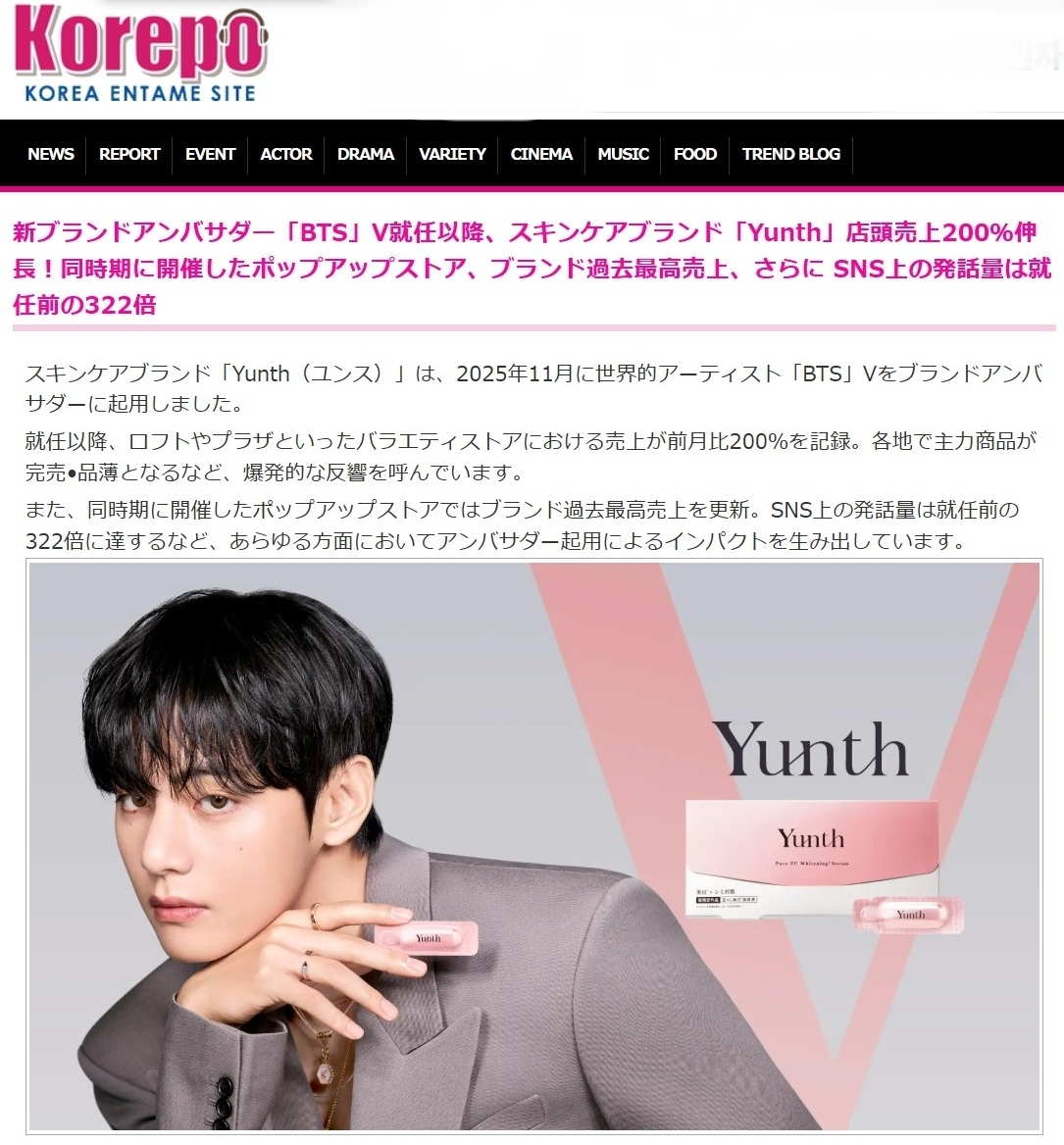 K-컬처를 다루는 일본 매체 코레포(Korepo)는 최근 뷔가 일본 뷰티브랜드 윤스(Yunth)의 글로벌 앰버서더로 선정된 지 한 달 만에 매출 200%라는 폭발적인 증가세를 기록했다고 전했다.