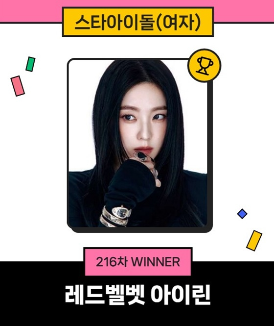 아이린은 11일 오후 3시 1분부터 18일 오후 3시까지 진행된 216차 스타랭킹 스타아이돌 여자 랭킹 투표에서 1만9164표를 획득해 1위에 올랐다.