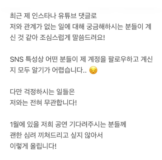 그러면서 "1월에 있을 저희 공연 기다려 주시는 분들께 괜한 심려 끼쳐드리고 싶지 않아서 이렇게 (글을) 올린다"고 설명했다.