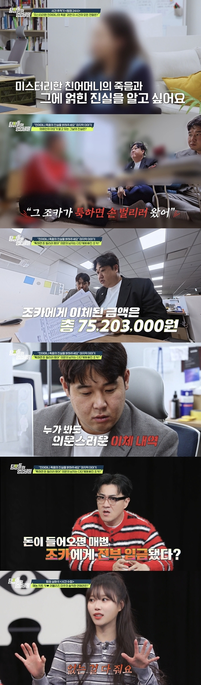 이번 주 방송에서는 조카의 정체와 그가 친모의 죽음에 어떤 연관이 있는지 본격적인 추적이 시작된다. 친모의 언니는 해당 조카에 대해 "툭하면 손 벌리러 왔다"며 그가 친모뿐 아니라 가족들에게 여러 차례 돈을 빌린 사실을 전한다. 이어 "다단계에 빠진 것 같다"는 말로 또 다른 충격을 안긴다. 그러던 중, 도깨비 탐정단은 친모의 사망 전 2년간의 계좌 거래 내역에서 의심스러운 정황을 포착한다. 대부업체 대출금은 물론 보험 해약 환급금, 카드 대출금까지 돈이 들어오는 즉시 전부 조카에게 이체된 내역이 발견된 것이다. 총 금액은 7500만 원에 달했다. 이에 도깨비 탐정단은 진실을 직접 확인하기 위해 조카의 거주지를 찾아 나선다. 과연 탐정단은 조카와 대면해 사건의 실체를 밝혀낼 수 있을지, 그 결말은 방송을 통해 공개된다.