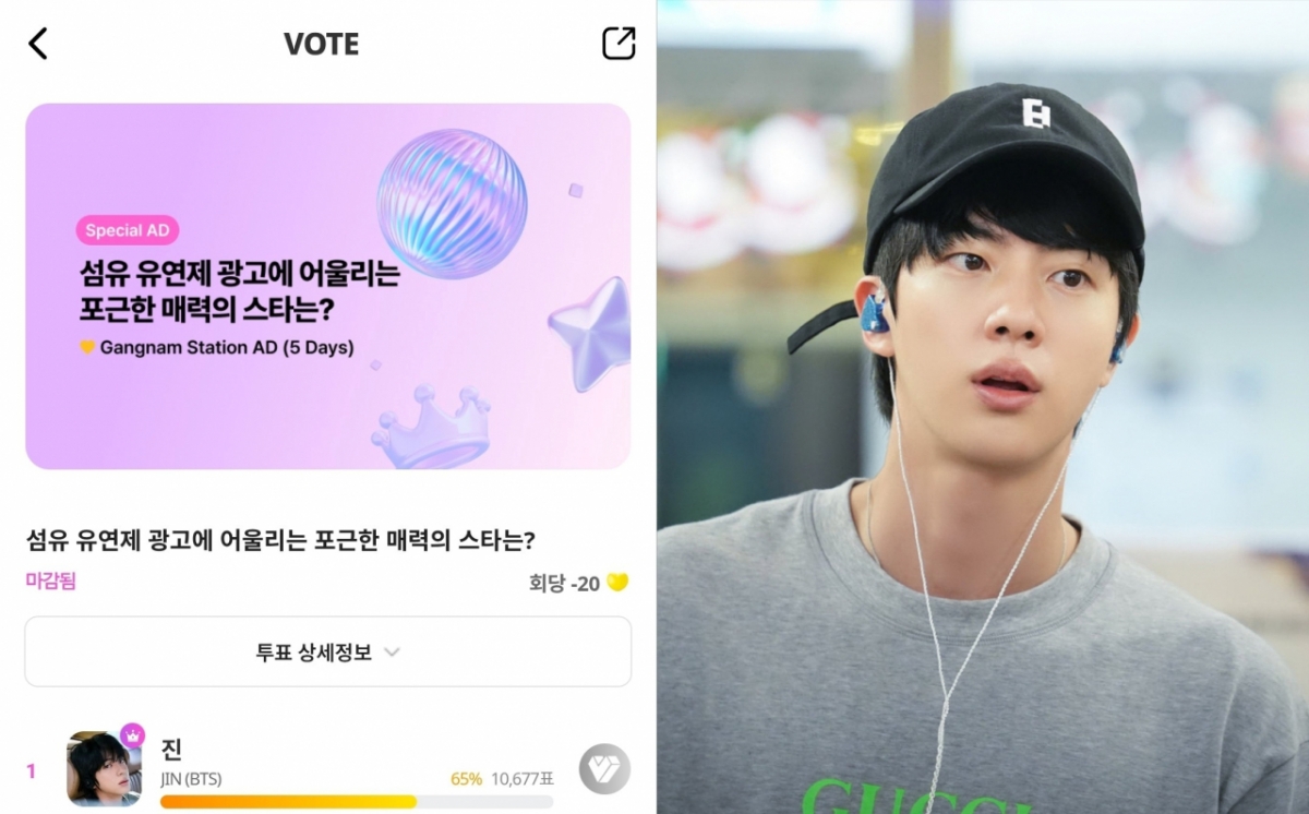 진은 마이원픽(MY1PICK)에서 지난 4일부터 10일까지 진행한 '섬유 유연제 광고에 어울리는 포근한 매력의 스타는?' 투표에서 1만 677표를 65%의 압도적인 득표율로 1위를 차지했다. 우승자 진에게는 5일간의 강남역 전광판 광고 특전이 제공된다.