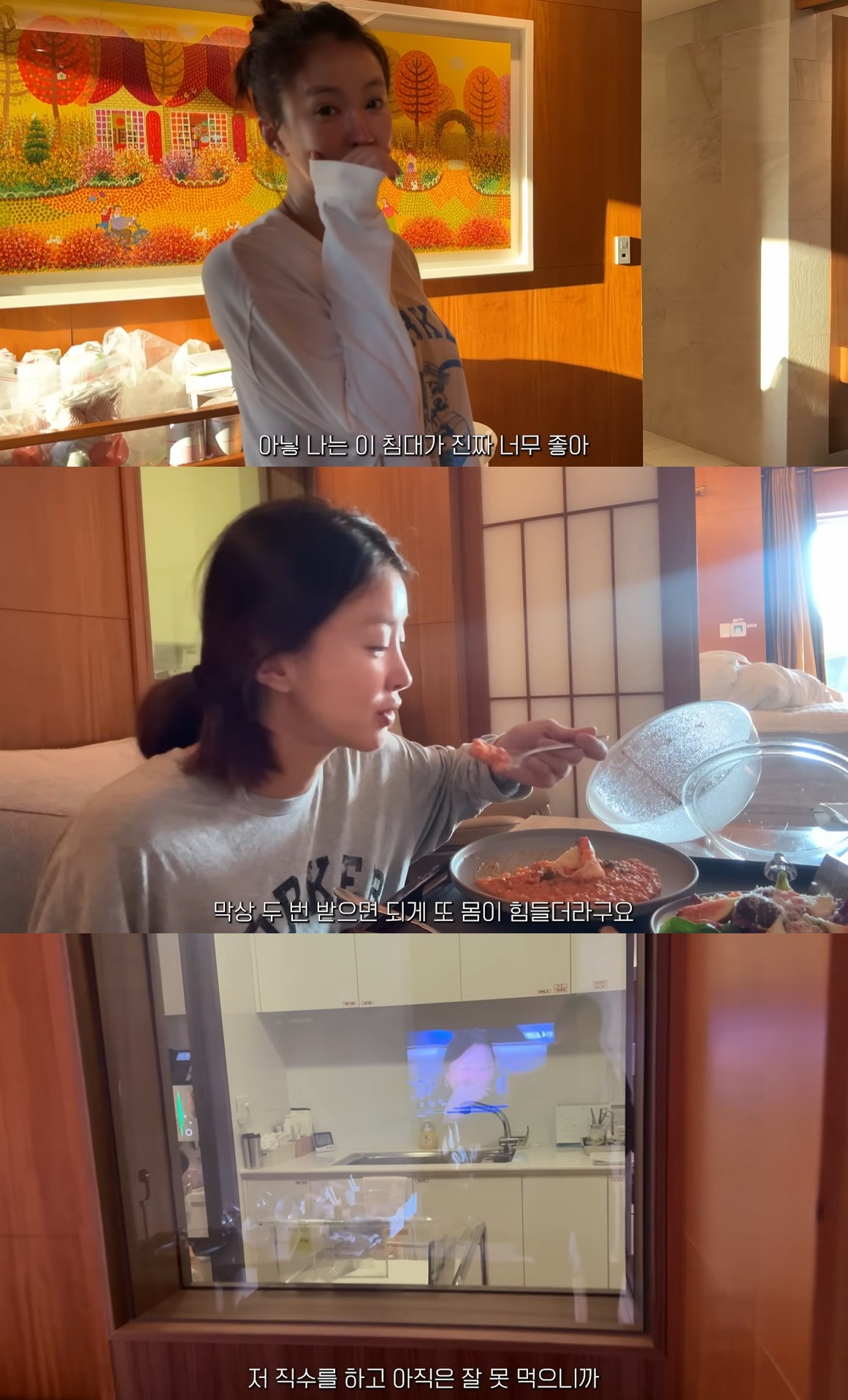 이시영은 "답답할 땐 나간다. 마사지도 다 한 층에서 받을 수 있다. 룸이 엉망이다. 아직은 잘하지 못하니까 유축해서 먹이고 있다"라고 전했다.