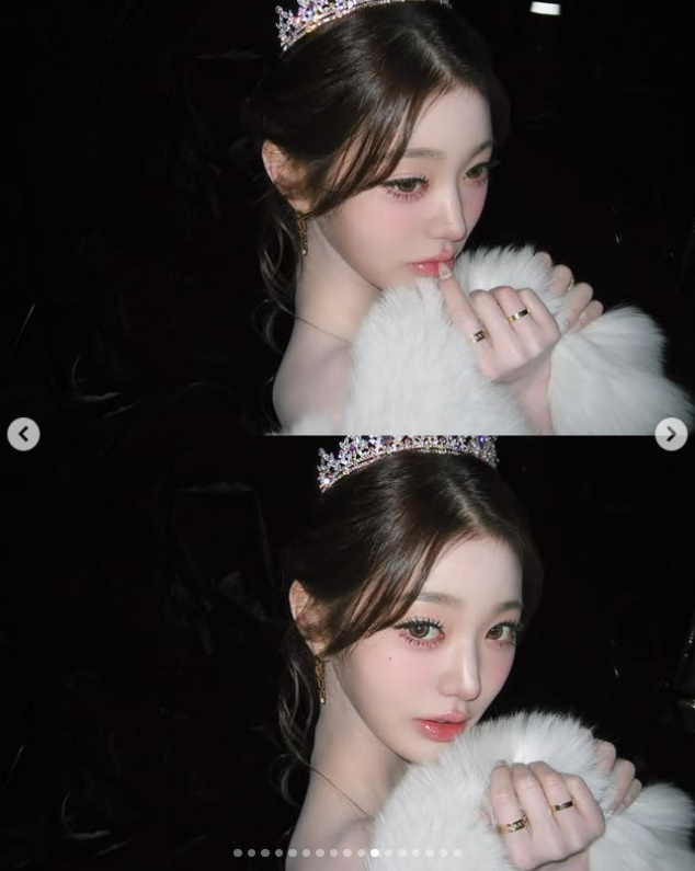 사진 속 장원영은 어두운 배경 속에서 화려한 크라운을 쓰고 카메라를 응시하고 있는 모습. 오프숄더 스타일의 화이트 퍼 의상을 입은 장원영은 또렷한 이목구비와 인형 같은 비주얼로 시선을 사로잡았다.