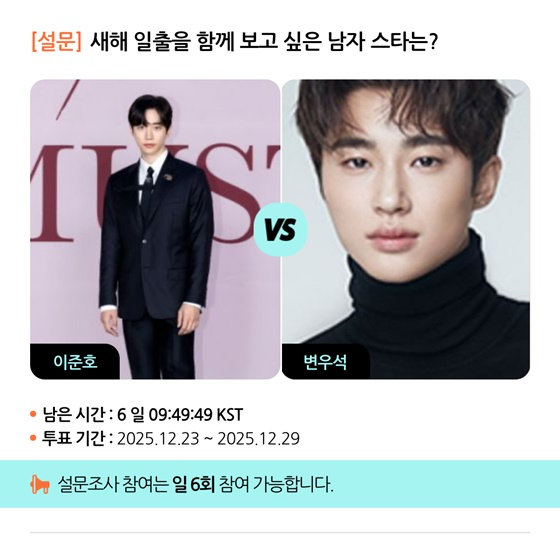 모바일 아티스트 종합 콘텐츠 앱 스타폴(STARPOLL)은 23일부터 29일까지 '새해 일출을 함께 보고 싶은 남자 스타는?'이라는 주제로 설문 조사를 진행한다.