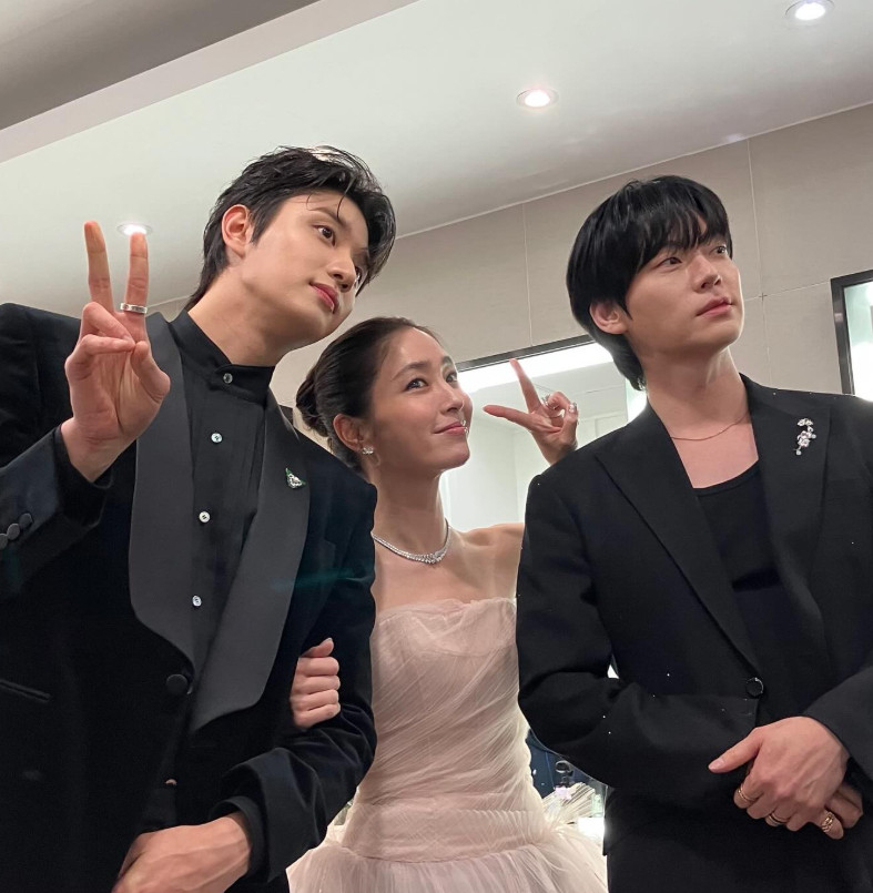 공개된 사진 속엔 이민정은 김재원, 안재현과 함께 카메라를 응시한다. 시상식에서 만난 세 사람은 드레스와 정장을 착용해 세련된 분위기를 뽐냈다.