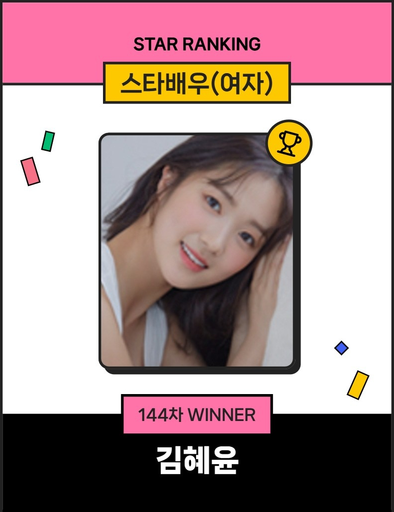 김혜윤은 18일 오후 3시 1분부터 25일 오후 3시까지 진행된 12월 3주(144차) 스타랭킹 스타배우 여자 랭킹 투표에서 2만 3163표로 1위에 올랐다.