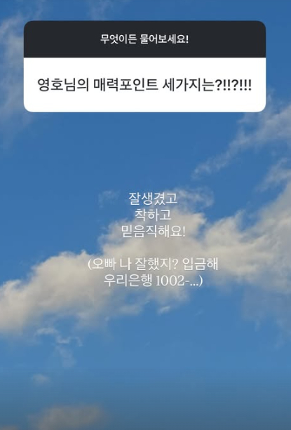 또한 "친구들이 아빠 얘기할 때 아율이는 자연스럽게 홍구(영호) 얘기를 한대요. 친구가 '우리 아빠 배 디따 많이 나왔다' 하면 '우리 홍구삼촌이 더 디따디따 배뚱땡이다' 하면서요"라며 "오빠가 엄청 많이 노력했어요. 아율이는 저처럼 자연스럽게 홍며들었습니다"라고 답했다.
