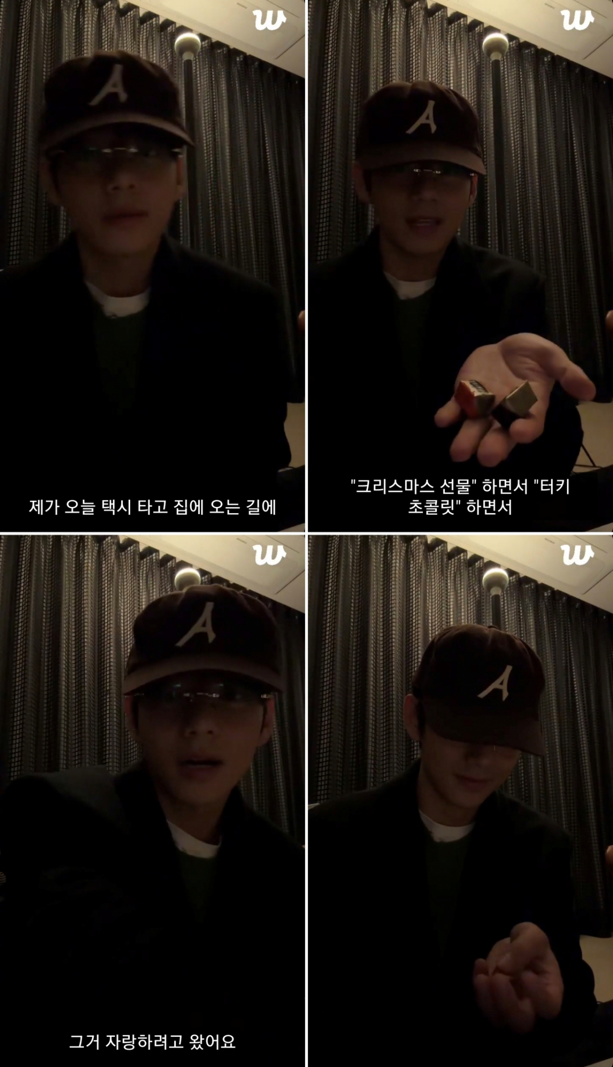 뷔는 "제가 오늘 택시를 타고 집에 오는 길에 택시기사 아저씨께서 '이거는 깜짝 선물이에요. 크리스마스 선물 터키 초콜릿' 이러면서 주셨어요. 그래서 진짜 감사합니다하고 받았어요. 그거 자랑하려고 왔어요"라고 말했다.