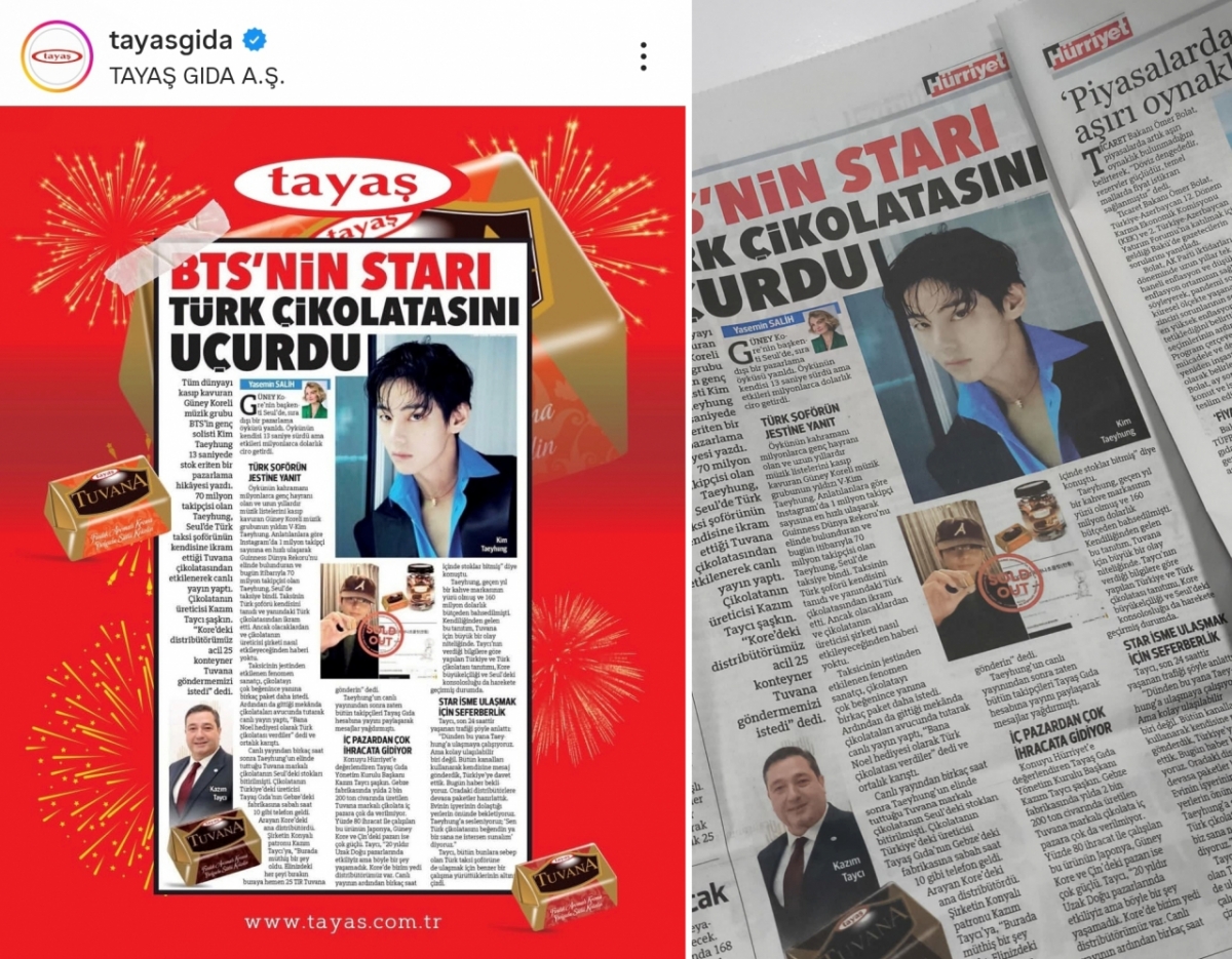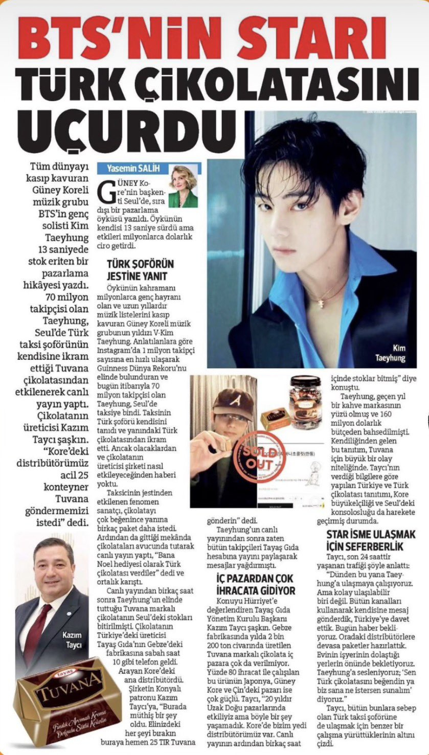 휘리예트는 "7000만 명의 팔로워를 보유한 김태형(뷔 본명)이 택시 기사가 건넨 투바나 초콜릿에 감명을 받아 라이브 방송을 진행했다. 이후 한국 유통업체에서 투바나 초콜릿 컨테이너 25개 분량을 긴급 주문했다"고 전했다.