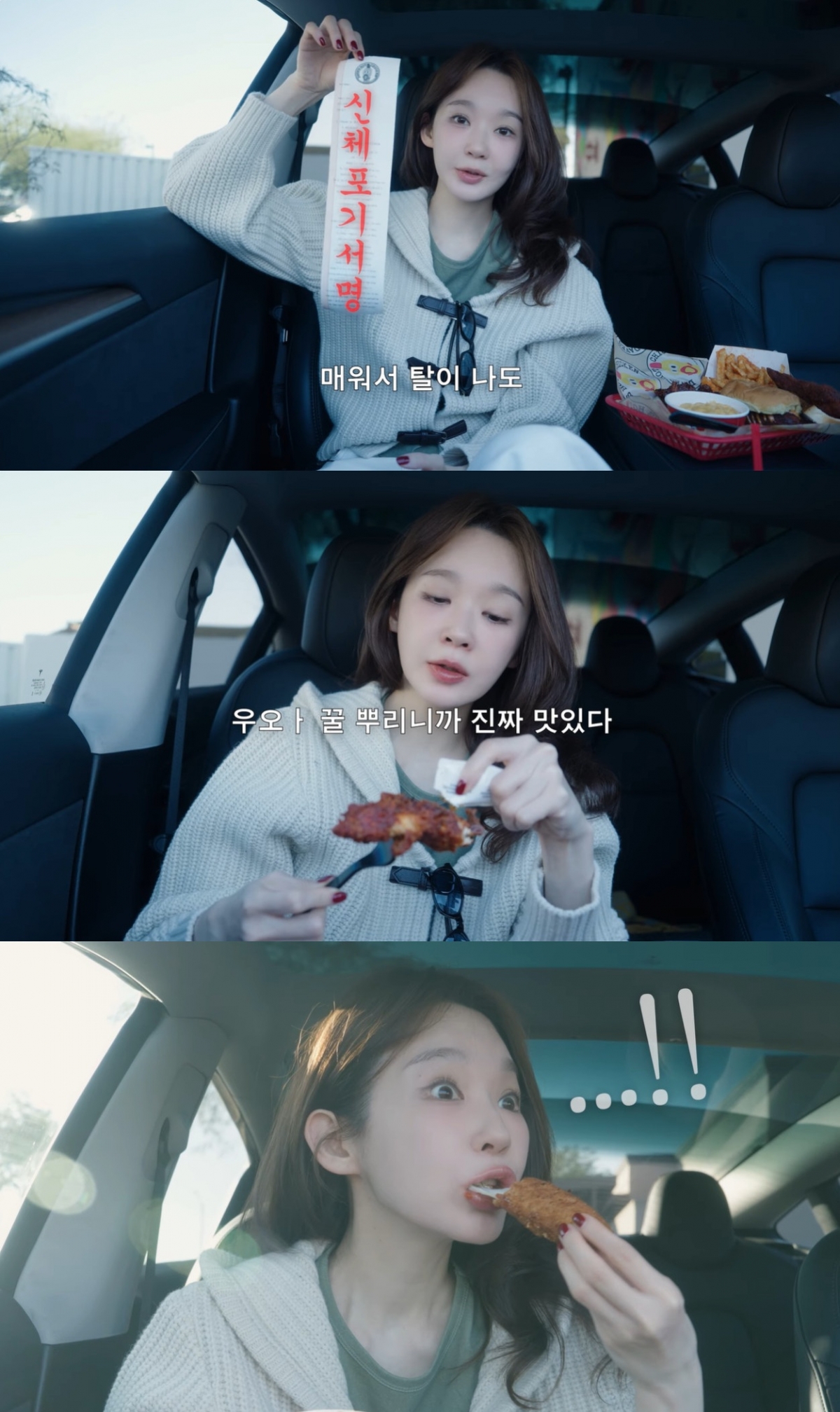 강민경은 "맥앤치즈로 속을 좀 달래주고 비비큐 치킨이 새로 나왔다더라. 이것도 좀 맵다. 피클이 진짜 맛있다. 꿀 뿌리니까 진짜 맛있다. 꿀이 신의 한 수다"라고 사이드 메뉴를 먹었다.