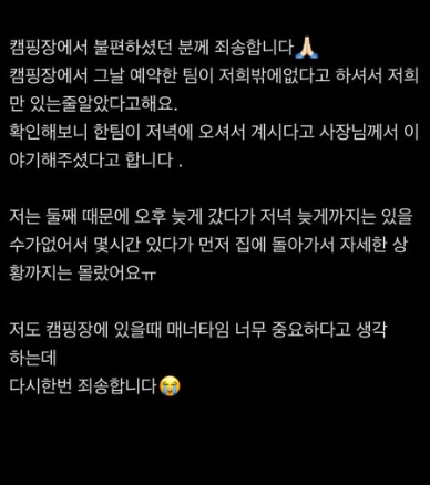 작성자는 "우리나라 국민성 아시겠지만, X진상은 어디에나 있다. 그래서 돈을 지불하고 관리해 주는 통제자가 필요하다. 캠핑장은 그 역할을 하지 못했다. 이곳 시스템이 대표자는 상주하지 않고 할머니에게 맡겨두신다. 문제는 그 할머니께서 친절하시기만 하시고 전혀 관리가 안 된다"라며 "엄청난 스트레스에 5세 아이랑 같이 온 저희 가족은 이미 멘털이 나가 있었다. 다음날 아침 남성 대표분이 캠핑장에 오셔서 이야기를 들으시곤 사과를 하셨다. 죄송하다며 레이트 체크아웃 비용 안 받으셨다. "저희는 이번 기회로 너무 정신적인 타격이 심해 한 두 달은 캠핑을 쉬기로 했다"라며 "위 내용은 정확히 벌어졌던 사실만 담겨있다"라고 전했다.