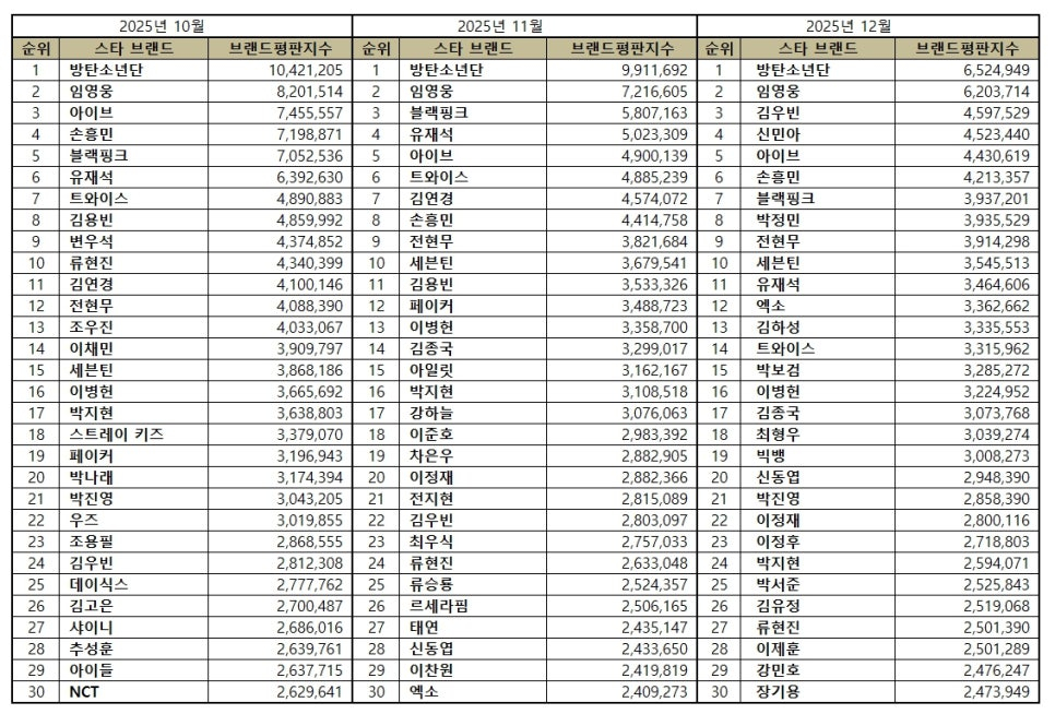 한편, 2025년 12월 스타 브랜드평판 1위는 완전체 활동 준비로 기대를 모으고 있는 방탄소년단(BTS)이 차지했으며, 최근 결혼 소식을 전한 배우 김우빈과 신민아가 각각 3위와 4위에 이름을 올렸다. 5위는 럭키 브랜드 아이콘으로 활약 중인 걸그룹 아이브(IVE)가 기록했다.