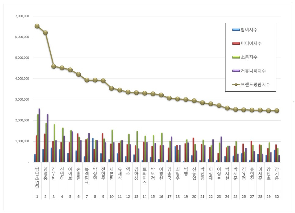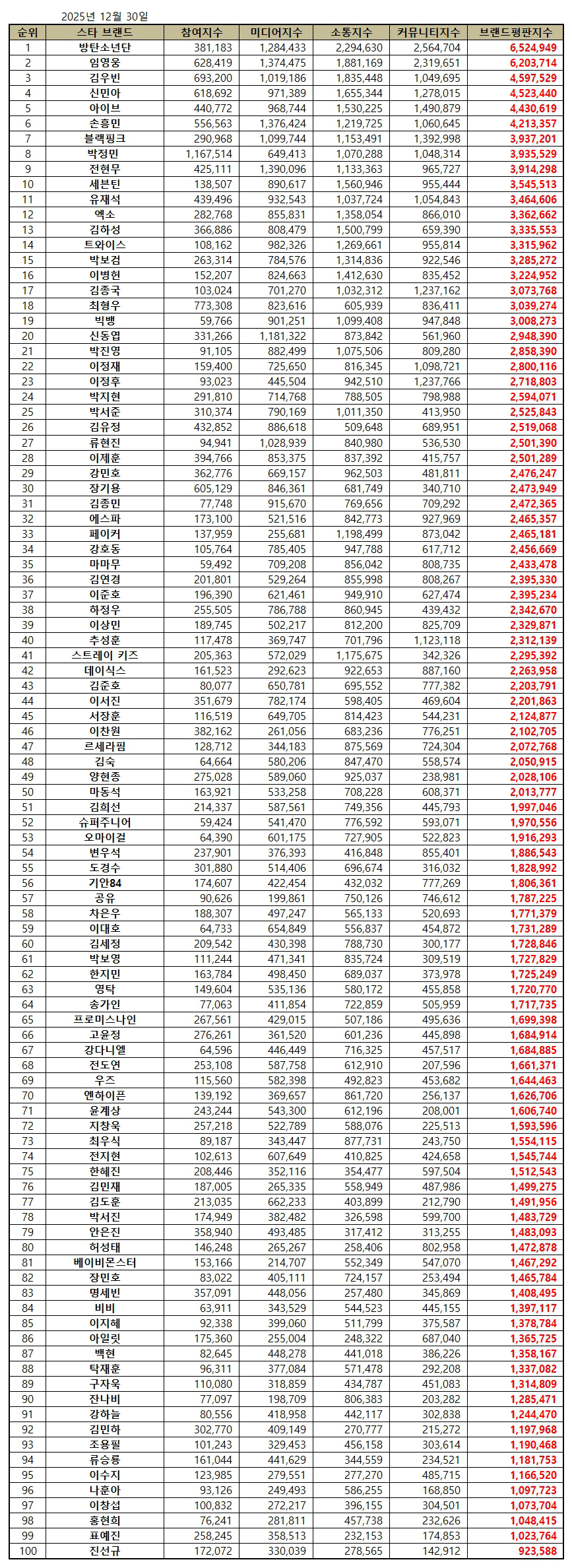 한국기업평판연구소가 12월 30일 발표한 2025년 12월 스타 브랜드평판 빅데이터 분석 결과에 따르면, 임영웅 브랜드는 참여지수 628,419, 미디어지수 1,374,475, 소통지수 1,881,169, 커뮤니티지수 2,319,651을 기록하며 브랜드평판지수 6,203,714로 전체 2위에 올랐다.
