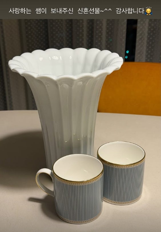 공개된 사진에는 김미숙이 온주완 방민아 부부의 신혼을 축하하며 보낸 선물이 담겨있다. 아름다운 커피잔과 물병이 시선을 사로잡는다.