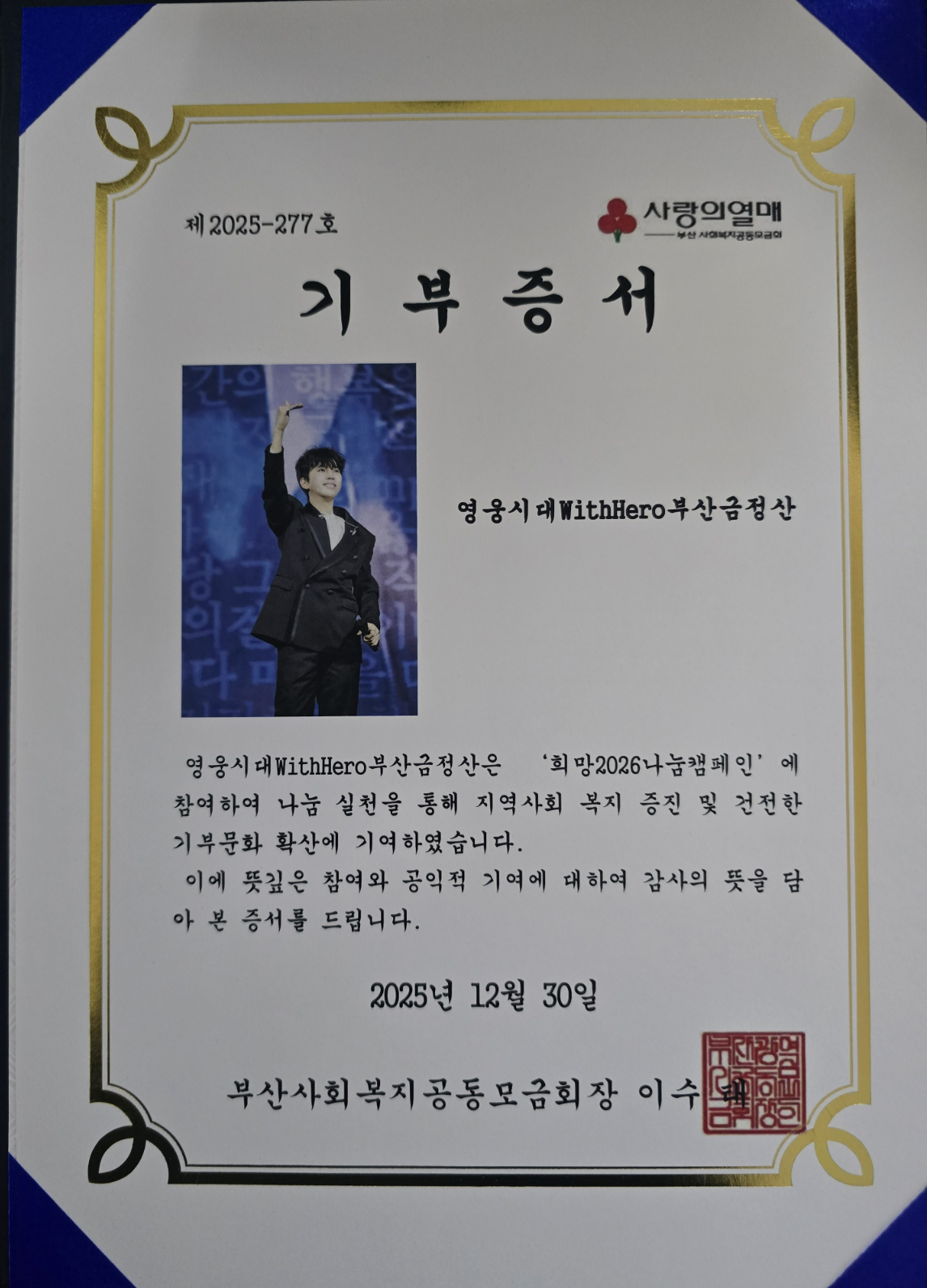가수 임영웅 팬클럽 영웅시대 With Hero 부산금정산은 연말을 맞아 12월 30일 부산 사랑의열매에 이웃 돕기 성금 300만원을 전달했다.