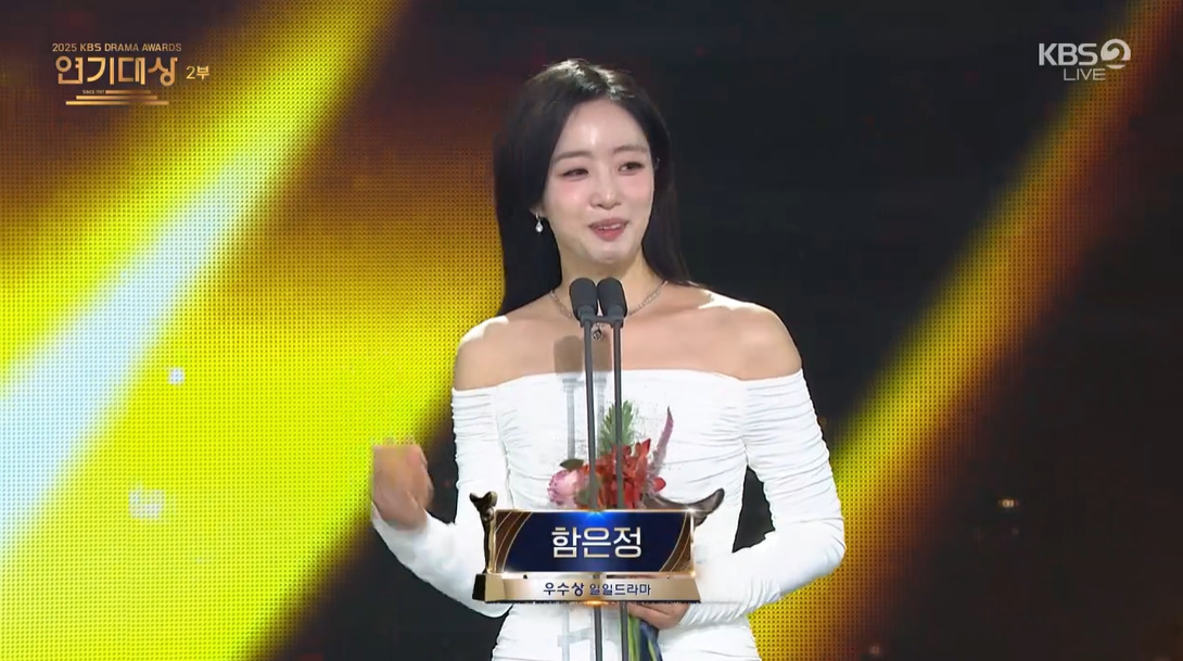 이어 함은정은 "작년에 우수상을 받을 때 엄마 얘기를 했었는데 1년이 지나고 나니까 조금 더 씩씩하게 살아갈 수 있는 것 같다. 엄마 작고 하고 한 달 뒤에 이 작품을 하게 돼서 걱정이 많았는데 엄마에게 영광을 돌리고 싶다. 집에서 보고 있을 아빠도 감사하다. 결혼해서 새로운 짝꿍이 된 신랑에게도 고맙다. 드라마 하는 동안 힘이 됐다. 시댁도 감사드린다"라며 웃었다.