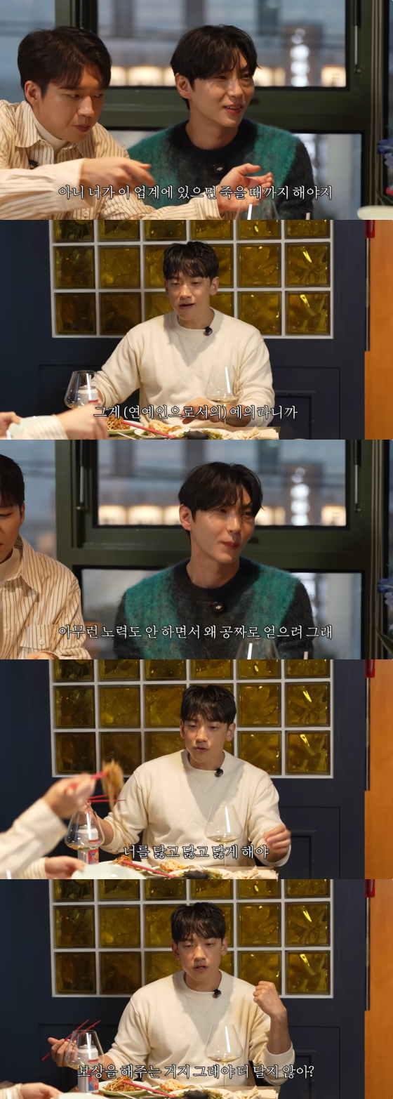 비는 "그게 연예인로서의 예의"라며 "아무런 노력을 하지 않고 공짜로 얻으려 하지 마라. 가만히 있다가 잘 되면 '이거 뭐야' 하면서 나태해진다. 그러다가 사건, 사고가 나는 거다"고 뼈 있는 조언을 건넸다.