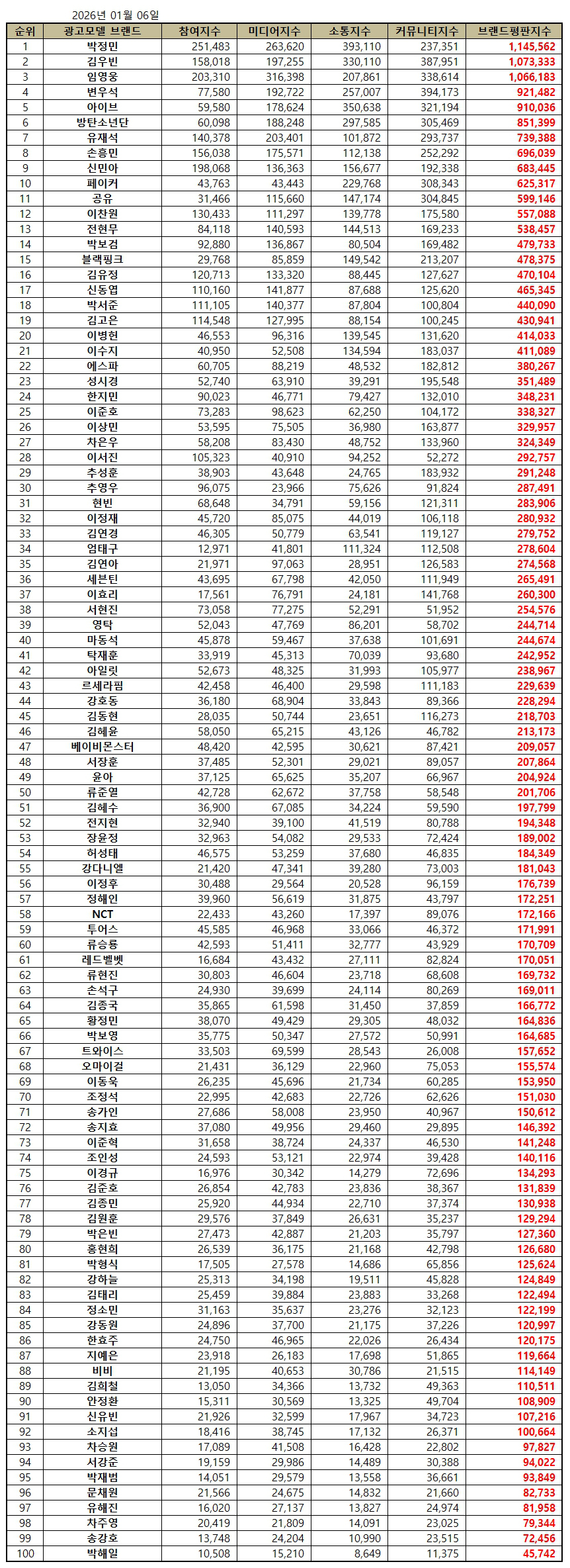 한국기업평판연구소는 2025년 12월 6일부터 2026년 1월 6일까지 측정한 광고모델 브랜드 빅데이터 28,641,341개를 소비자 행동분석을 통해 광고모델 브랜드에 대한 참여지수, 미디어지수, 소통지수, 커뮤니티지수로 브랜드평판지수를 측정했다. 지난 12월 광고모델 브랜드 빅데이터 30,225,203개와 비교하면 5.24% 줄어들었다.