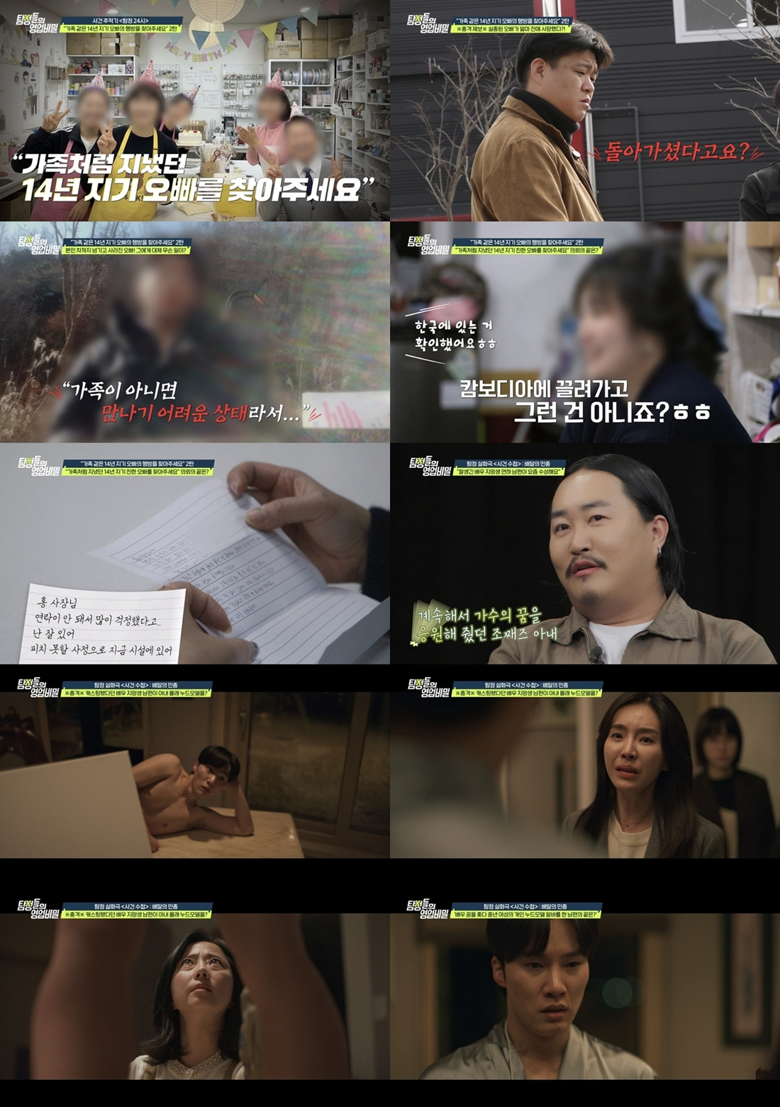 이어진 '사건 수첩'에서는 "배우 지망생 연하 남편이 수상하다"는 7살 연상 아내의 사연이 소개됐다. 의뢰인과 남편은 연극영화과 조교와 학생으로 만나 10년의 연애 끝에 결혼한 지 5년이 됐다. 의뢰인은 친정어머니가 대출을 받아 차려준 카페를 운영하고, 새벽에는 대리운전까지 하며 남편을 뒷바라지했다. 하지만 매달 적자를 면치 못했고, 남편은 오디션에 계속해서 떨어지며 답답함만 쌓여갔다. 그러던 중 남편은 "오디션에서 중요한 역할에 캐스팅됐다"며 거액의 계약금을 받았다. 또 작품 준비를 한다며 매번 제작사에서 보내준다는 픽업 택시를 타고 외출을 반복했다. 그러나 작품에 관해서는 "비밀 유지 계약서를 썼다"며 일체 알려주지 않았다.