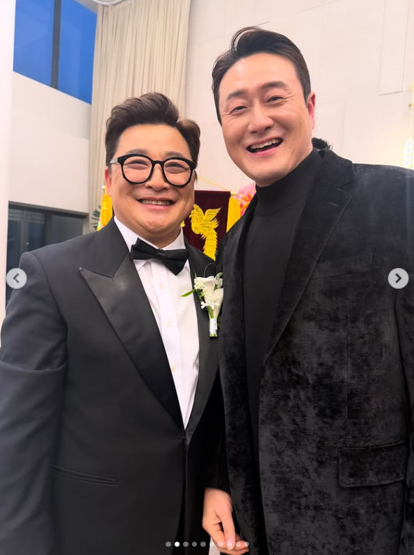 또 다른 사진에서는 최근 결혼 소식을 알린 윤정수와 김원효의 투샷이 담겼다. 턱시도를 차려입고 환하게 웃고 있는 '새신랑' 윤정수와 그 곁에서 자기 일처럼 기뻐하며 미소 짓는 김원효의 의리가 돋보인다.