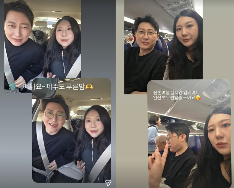 28기 정숙은 6일 상철과 함께 찍은 사진을 통해 "떠나요~ 제주도 푸른밤. 신혼여행 실시간 업데이트. 임산부 우선탑승 좋아요"라는 글을 남겼다.