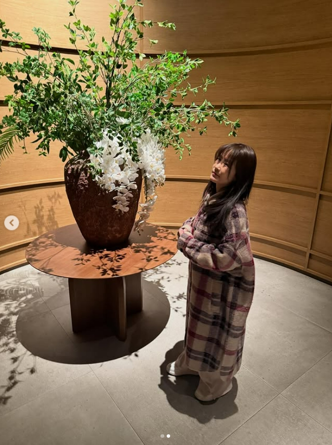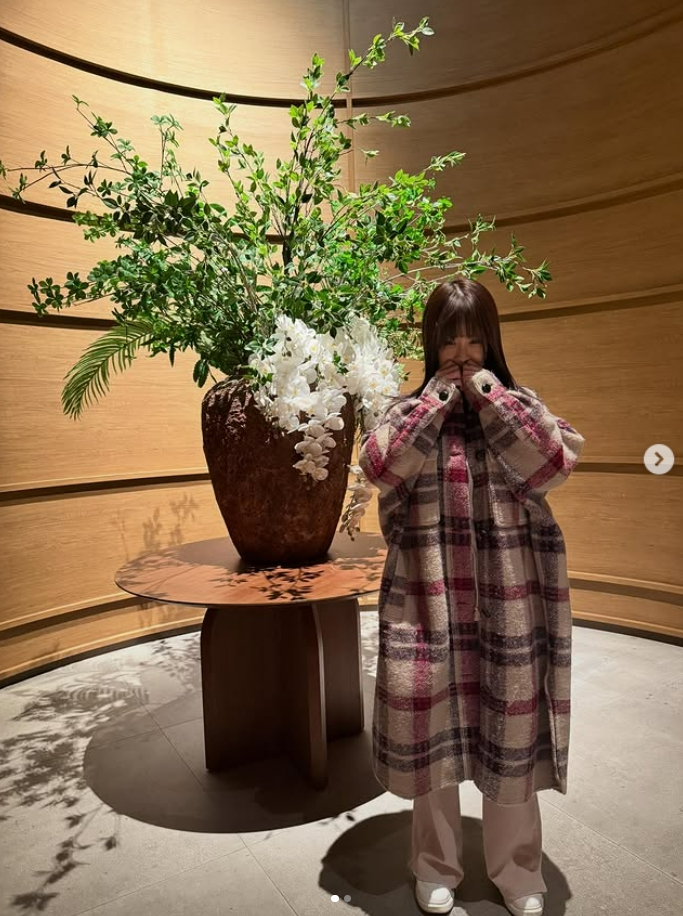 사진 속 김지민은 대형 화분 옆에서 다채로운 포즈를 취하고 있는 모습. 포근한 체크 패턴의 롱 코트를 입고 특유의 러블리한 매력을 발산하고 있다. 입을 가린 채 수줍게 웃거나 꽃을 응시, 청순하면서도 귀여운 분위기까지 자아냈다.