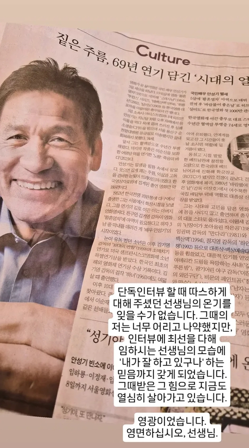 이어 그는 "단독 인터뷰 할 때 따스하게 대해 주셨던 선생님의 온기를 잊을 수가 없습니다. 그때의 저는 너무 어리고 나약했지만 인터뷰에 최선을 다해 임하시는 선생님의 모습에 '내가 잘하고 있구나' 하는 믿음까지 갖게 되었습니다. 그때 받은 그 힘으로 지금도 열심히 살아가고 있습니다. 영광이었습니다. 영면하십시오 선생님"이라며 안성기를 향해 애도의 메시지를 전했다.