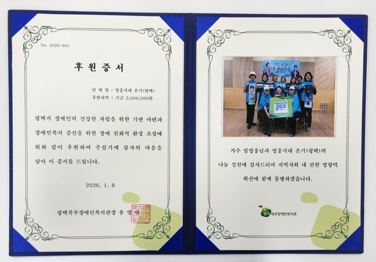 평택시 장애인복지관 관계자는 "임영웅 팬클럽의 따뜻한 마음에 진심으로 감사드린다"며 "기부금은 장애인의 복지 증진과 자립을 돕기 위한 다양한 프로그램에 소중히 투명하게 사용하겠다"고 밝혔다.