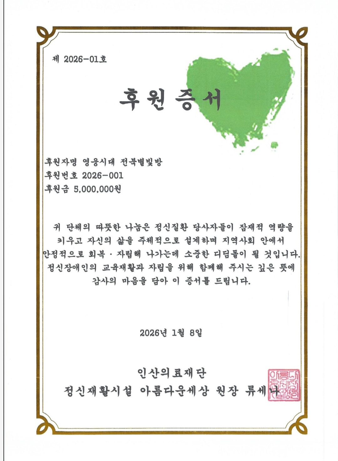 가수 임영웅 팬들의 모임인 '영웅시대 전북별빛방'은 인산의료재단 정신재활시설 아름다운세상을 위해 1월 8일 500만원을 후원했다. 팬들은 시설에 등록된 당사자들이 자신의 삶을 주체적으로 설계하고, 회복과 자립의 길로 나아가는 데 실질적인 도움이 되기를 바라는 뜻을 전했다.