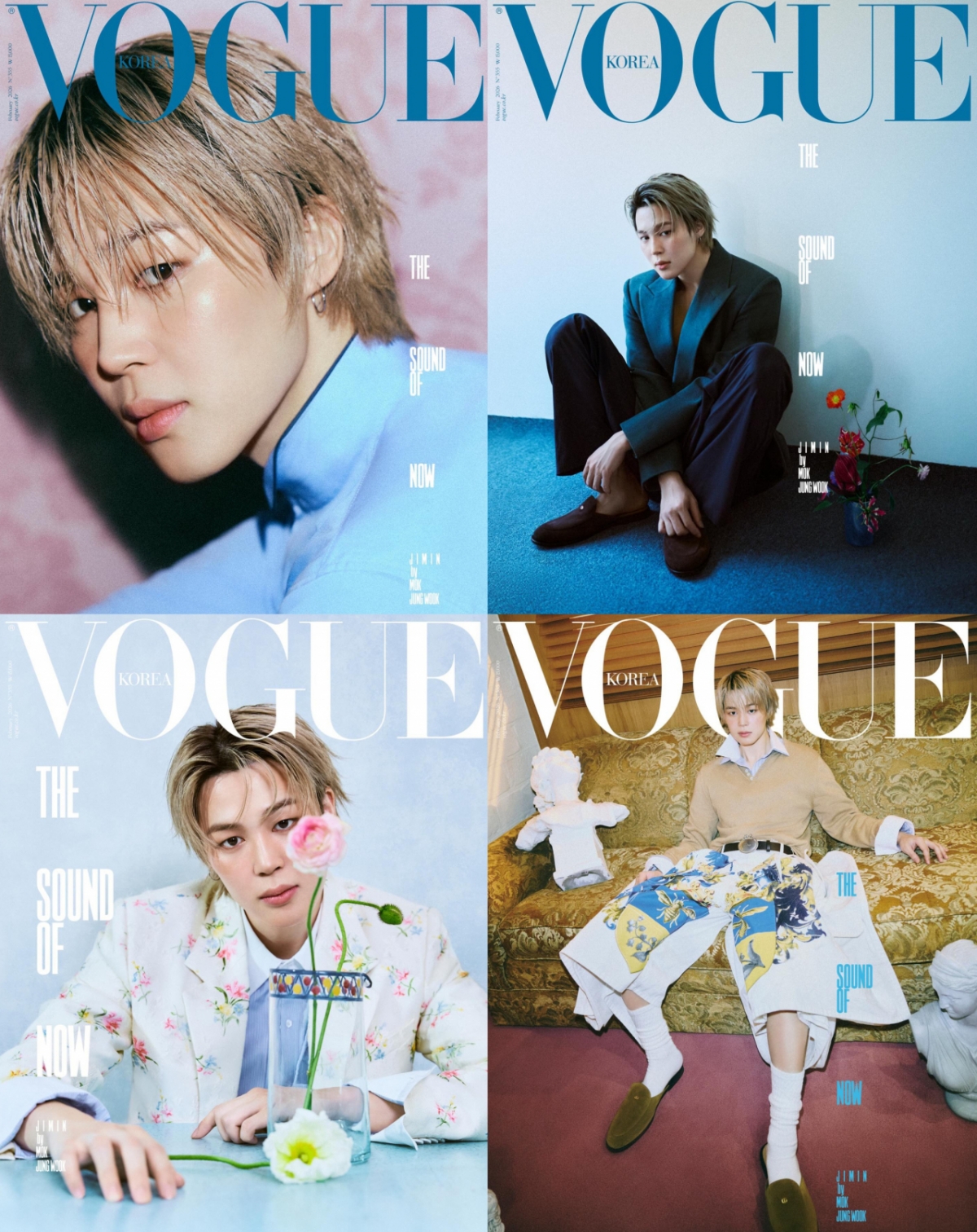 지민은 이번 보그 코리아 2월호 화보에서 금발에 무쌍의 큰 눈으로 몽환적인 분위기를 자아냈다. 또한 춤과 운동으로 다져진 균형 잡힌 신체 비율을 뽐냈으며, 디올 꽃무늬 재킷과 블랙 베스트 및 짙은 청록색 슈트를 완벽하게 소화했다.