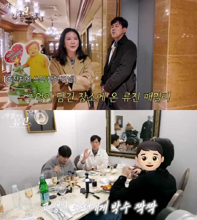 이날 류진 부부는 가족 모임을 위해 큰아들 찬형의 돌잔치를 연 호텔에 방문했다. 류진은 "그때 저는 '종합병원2'라는 드라마 촬영 중이어서 배우님들이 많이 왔었다. 근데 찬형이는 기억을 못 한다"고 말했다.