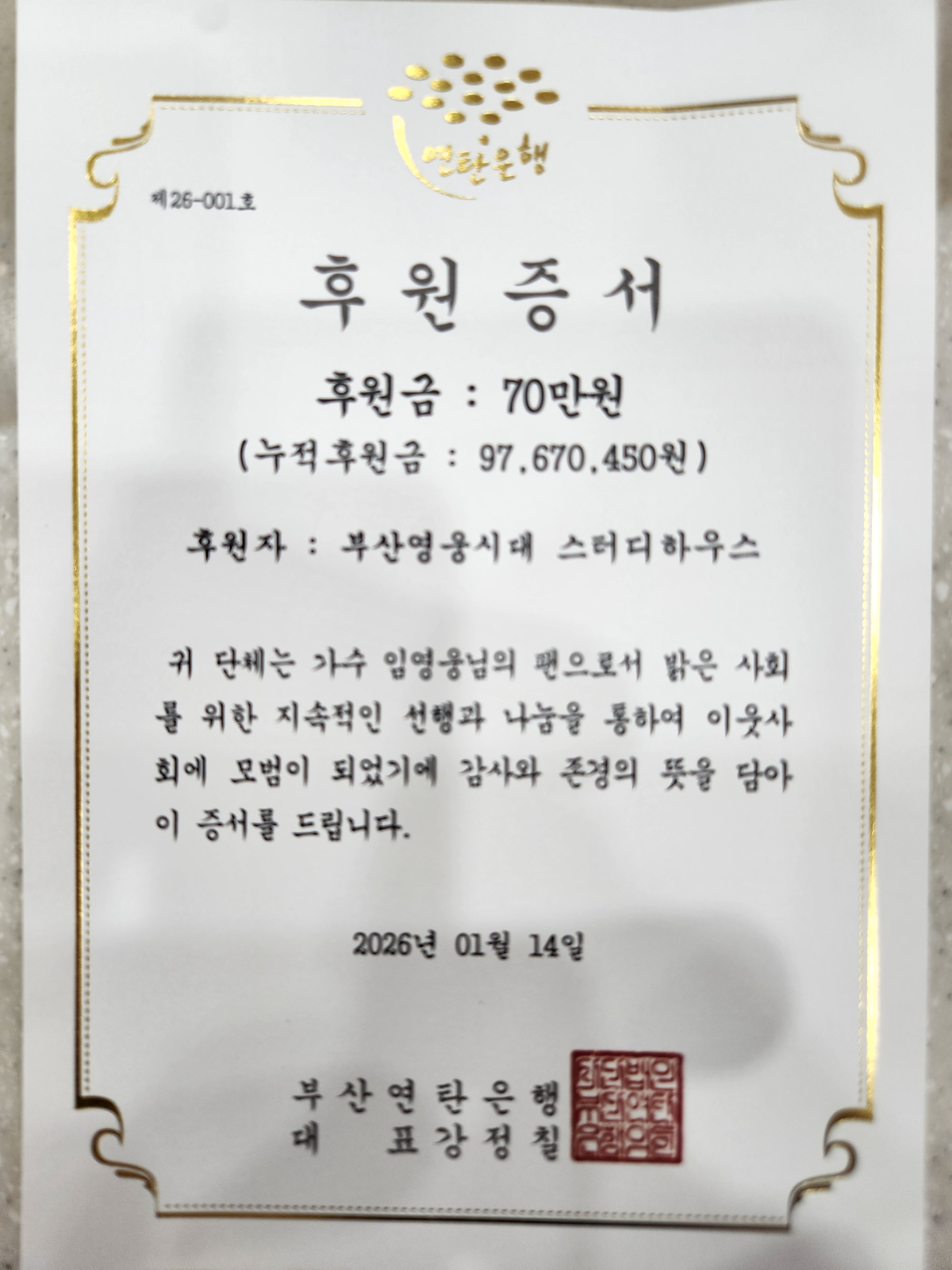 꾸준히 선행을 이어온 것으로 알려진 임영웅의 팬클럽 부산영웅시대 '스터디하우스'는 '혼자가 아닌 같이의 힘으로'라는 슬로건 아래 "앞으로도 독거 노인들을 위해 지속적으로 후원과 봉사를 하며 임영웅 의선한 영향력을 널리 퍼뜨리겠다"라고 아름다운 마음을 전했다.