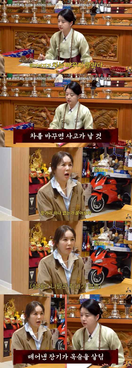 본격적인 점사에서 이다영은 "몸을 다치게 될 것"이라며 "몸에 칼을 대야 하는 형국이다. 깁스라도 한번 하고 지나가야 한다. 그리고 할아버지(신령)가 차는 바꾸지 말란다. 2026년 해운 안에 차를 바꾸면 사고를 당한다고 하신다"고 공수했다.