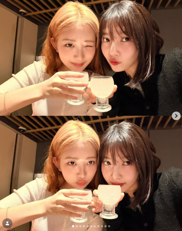 사진 속 조이와 레이는 먹음직스러운 음식을 앞에 두고 장난기 넘치는 포즈를 취하고 있는 모습. 두 사람은 나란히 앉아 술잔을 기울이며 즐거운 시간을 보내고 있다.