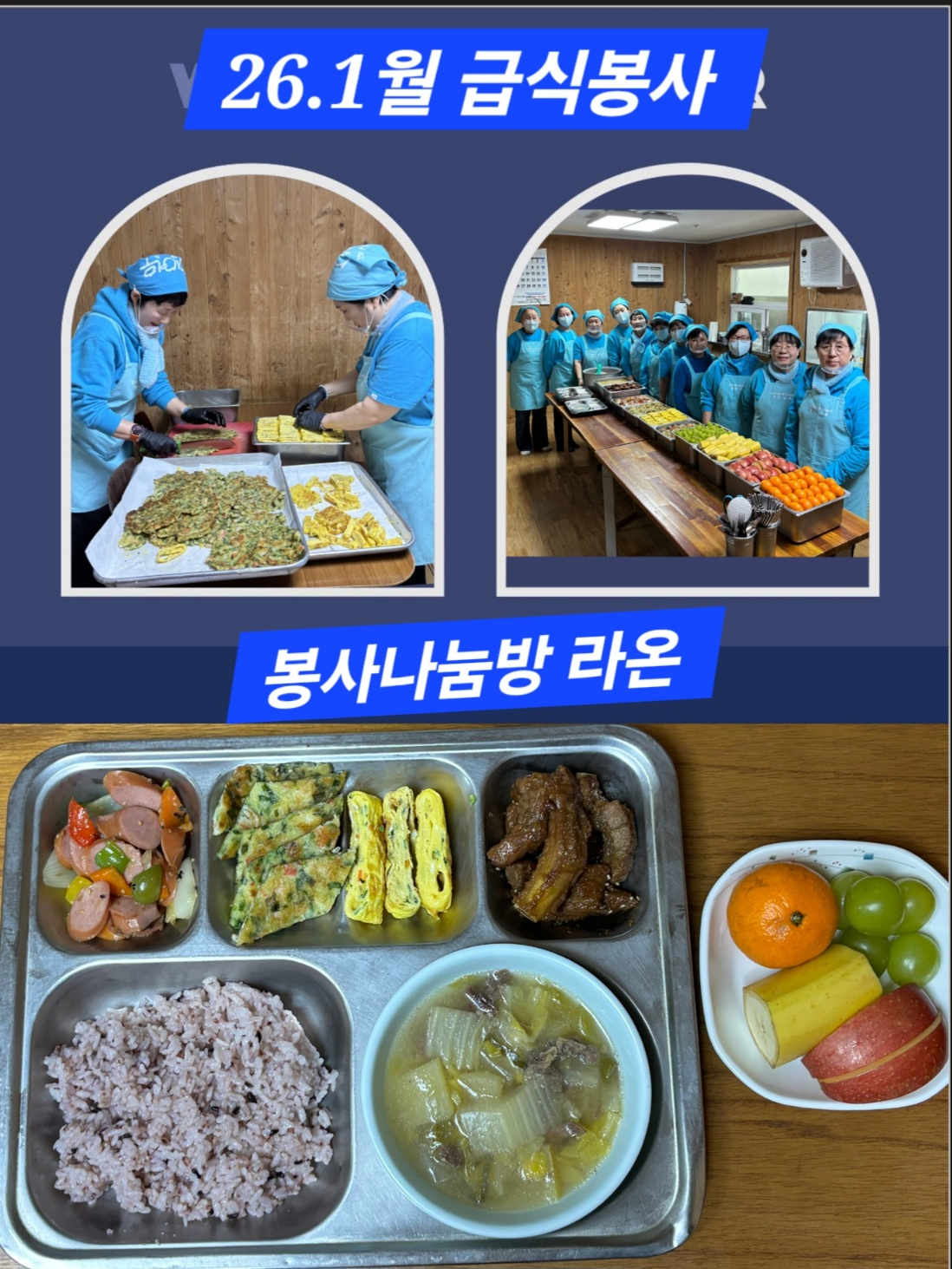 이달 '라온'이 준비한 식단은 돼지갈비구이, 소고기배추된장국, 소세지볶음, 계란말이, 새우부추전, 버섯볶음이다. 간식으로는 캔디류, 과자류, 우유, 음료수 등을, 과일로는 바나나, 사과, 샤인머스켓, 귤을 제공했다. 또한 한우 양지 12kg도 후원했으며, 총 후원금액은 232만원이다.