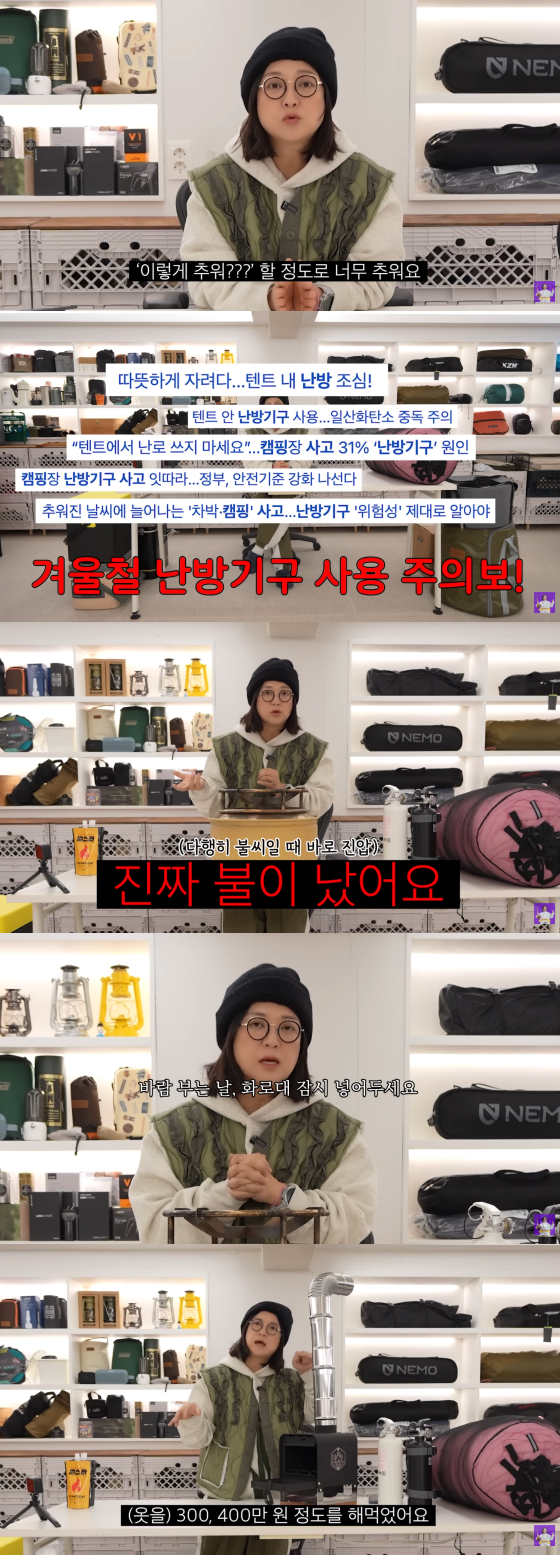 그는 "캠핑하다가 춥다고 화로대를 텐트 안으로 가지고 들어가는 분들이 있는데, 절대 해서는 안 되는 행동"이라며 "화로대는 텐트 밖에서만 사용해야 한다"고 말했다.
