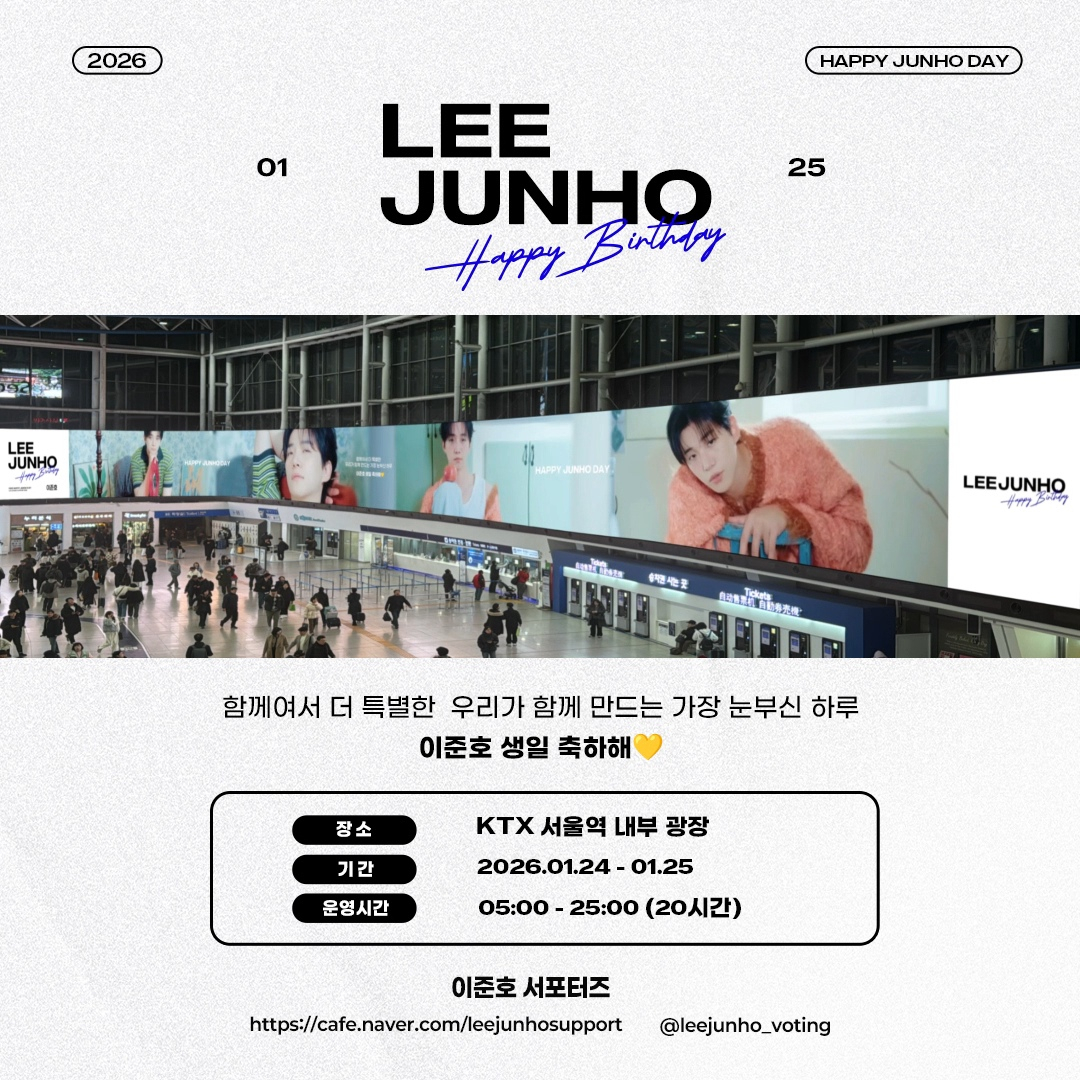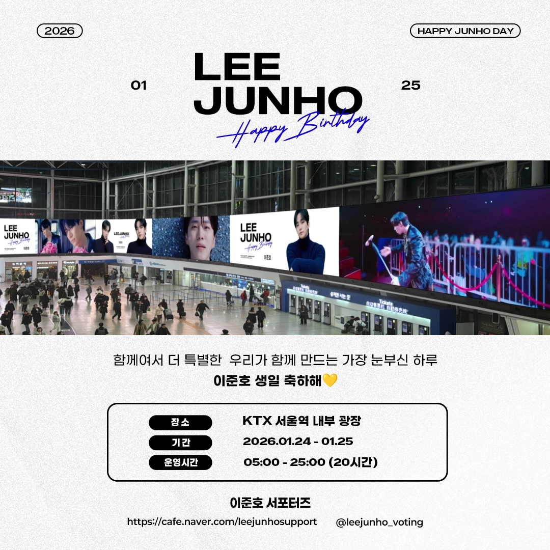 광고 영상은 이준호 특유의 고급스럽고 세련된 분위기를 담아 제작됐으며, 유동 인구가 많은 서울역을 찾는 시민들과 전국 각지에서 팬미팅을 위해 모이는 팬들에게 특별한 의미를 전할 예정이다. 이번 광고는 팬들이 자발적으로 기획한 이벤트로, 이준호의 팬미팅과 생일을 함께 축하하는 뜻깊은 자리로 마련됐다.
