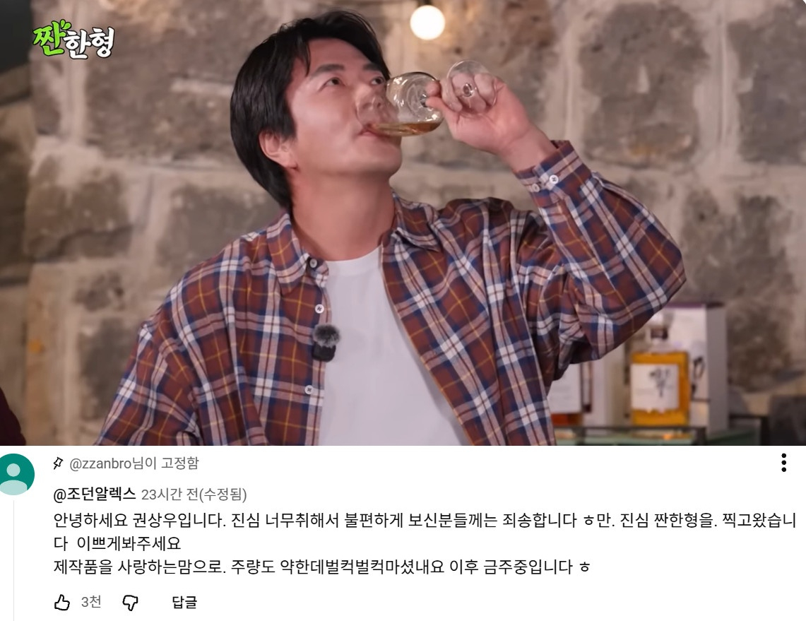 이에 이 영상에 권상우가 직접 댓글을 썼다. 그는 "안녕하세요. 권상우이다. 진심 너무 취해서 불편하게 보신 분들께는 죄송하다. 진심 '짠한형'을 찍고 왔다. 이쁘게 봐달라. 제 작품을 사랑하는 맘으로 주량도 약한데 벌컥벌컥 마셨다. 이후 금주 중이다"라고 솔직하게 고백했다.