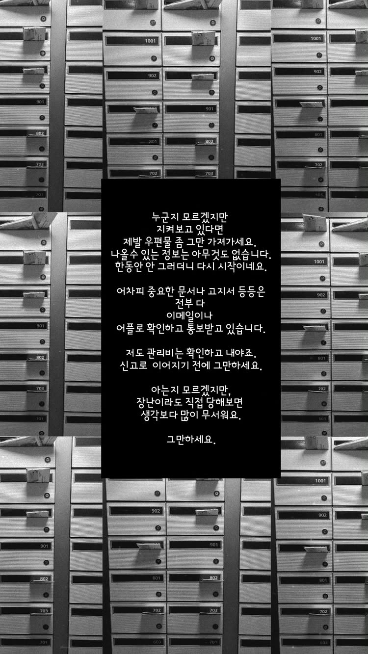 그는 "어차피 중요한 문서나 고지서 등등은 전부 다 이메일이나 어플로 확인하고 통보받고 있습니다. 저도 관리비는 확인하고 내야죠. 신고로 이어지기 전에 그만 하세요"라고 전했다.