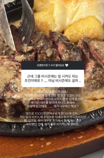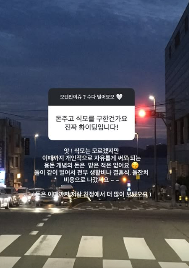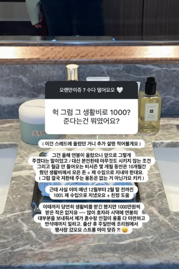 김지연은 생활비로 1000만원 준다는 것과 관련, "그건 올해 연봉이 올랐으니 앞으로 그렇게 주겠다는 말이었고 대신 본인한테 아무것도 시키지 않는 조건 그리고 월급 안 들어오는 비시즌 몇 개월 동안은 10개월간 줬던 생활비에서 모은 돈, 제 수입으로 지내야 한다고 했다. 근데 사실 이미 매년 12월부터 2월 말 전까지 100% 제 수입으로 지냈다. 이때까지 당연히 생활비를 받긴 했지만 1000만원씩 받은 적은 없다. 많이 효자라 시댁에 연봉의 대부분을 보내줘 제가 혼수랑 아이 용품 다 마련하고 만삭 때까지 일하고 출산 후 주일 만에 조리원에서 행사장 갔다"라고 설명했다.