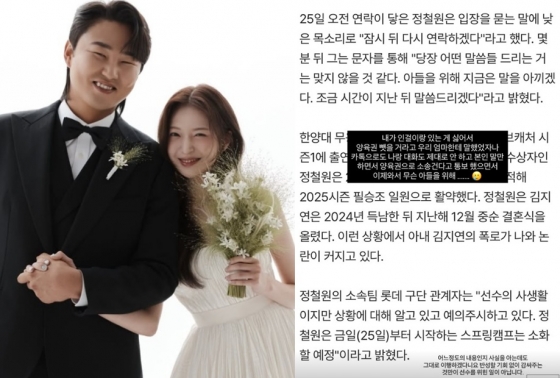 김지연과 정철원은 결혼 전 임신 소식을 먼저 알렸으며, 지난해 8월 첫 아들을 품에 안았다. 이후 두 사람은 출산 약 4개월 만인 지난해 12월 14일 서울 모처에서 결혼식을 올리며 정식 부부가 됐으나, 결혼 한 달여 만에 파경 위기를 맞게 됐다.