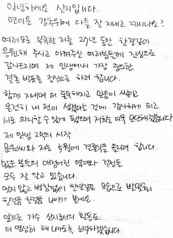 또한 신지는 지난해 문원과 결혼 계획을 처음 알렸을 당시 쏟아진 우려의 시선을 의식한 듯 "많은 분의 애정 어린 염려와 걱정들 모두 잘 알고 있다"며 "잊지 않고 변함없이 한결같은 모습으로 발맞춰 한 걸음 한 걸음 나아가 보겠다"고 전했다.